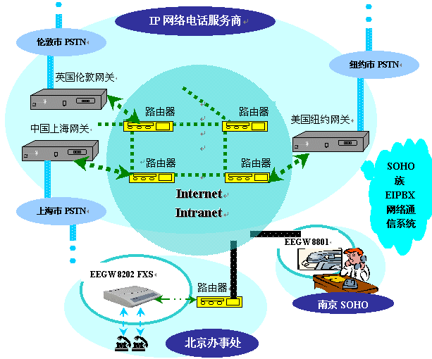 目前,在全球各地蓬勃发展起一项新兴行业——IP网络电话服务商,他们利用遍布全球、资源丰富的Internet / Intranet网络,组织自己的IP电话核心网络,将该网络的服务开放给各地的公众。其核心网络的网关完全遵照ITU-T H.323标准,可以解决电话号码与IP地址的映射,IP地址解析,路由寻路等问题。能够实现SOHO族通过该网络接入全球各地的市话。