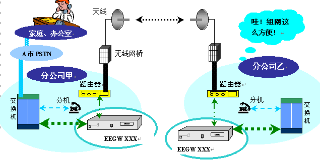 无线方式下EIPBX网络通信系统的组网单位是离散且对等的,下面以甲、乙两个有线局域网,通过两台无线网桥互联为例。