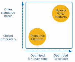 传统的平台是基于封闭的、非统一标准的技术并为按键式输入应用而设计的,而Nuance NVP平台是开放的、基于统一标准的语音平台产品,它能够支持客户公司已有的IT投资和基础设备,同时可以加入语音的应用,提高了信息传递的自动化程度和客户的满意度。