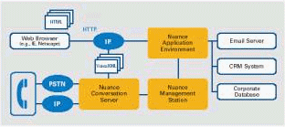 Nuance Conversation Server对话服务器包括了与Nuance 语音识别模块集成在一起的VoiceXML解释器,文语转换器(TTS)以及声纹鉴别软件。通过标准的互联网络协议,Nuance 对话服务器能得到Nuance 应用环境中产生的VoiceXML应用程序。Nuance对话服务器通过廉价的、非定制 的语音卡或者VoIP (Voice over IP)的支持,还能提供对电话网的接口。