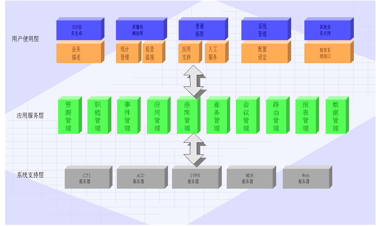采用功能分散,统一管理的设计模式。各组件功能相对独立,分布式处理各项事务,它们的有机结合实现了功能完善的ACD服务器。各组件的预留接口提供了功能扩充的有效途径。功能包括: