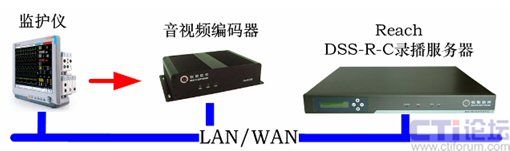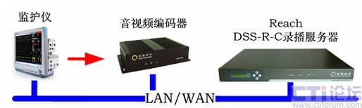 锐取远程医疗系统前端视音频编码器将采集到的手术室监护仪的信号进行实时编码和压缩,通过网络传送给多媒体录播系统远程医疗系统后台服务器上。
