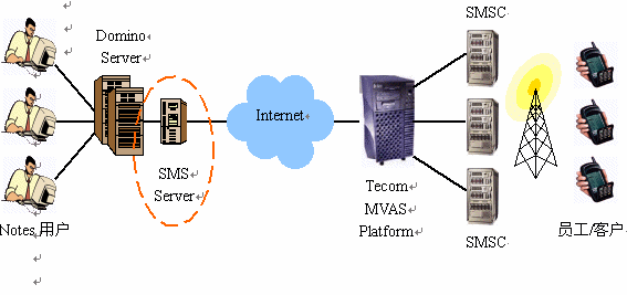 扩展短消息服务器Domino Everyplace SMS Server与GSM网络连接有两种方式,如果Domino Server可以和互联网连接,则建议使用如下模式,即直接通过互联网与泰康公司的MVAS平台相连,这种方式的好处是速度快,覆盖范围广,模式灵活,功能齐全,稳定可靠: