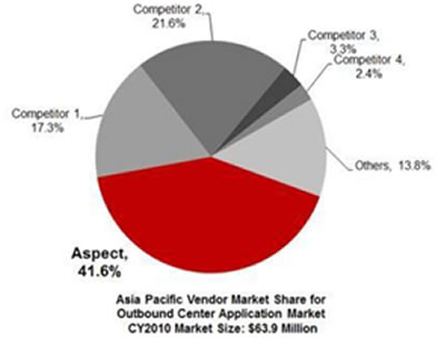 Aspect持续占据整个亚太地区外呼拨号器产品市场领导者地位。根据Frost & Sullivan的最新调研报告——《亚太地区联络中心应用软件市场》,Aspect拥有2010年亚太地区外呼系统市场近一半的市场份额(41.6%)。