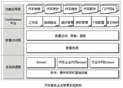 CareBusiness Suite主要包含了汽车销售管理系统、汽车养护管理系统、汽车维修管理系统和汽车配件管理系统等系统模块,这些系统及其系列模块统一构建于CareBusiness 平台之上,模块之间既相对独立,又可以有机耦合。汽车销售服务企业可以根据自身的业务范围、特点和管理需要,按需选择其中的某些模块,组成自己的管理信息系统。
