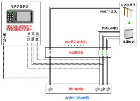 1. 电话线并联方式:(在配线架上将电话线路一分为二,一路到电话机,一路到录音卡)
