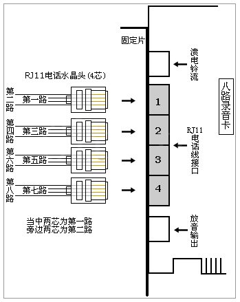 3. 8路录音卡接线方式:(每个RJ11水晶头,当中两芯为第一路,旁边两芯为第二路)
