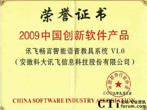 CTI论坛(ctiforum)9月8日消息:日前,讯飞畅言语音教具系统荣获“2009中国创新软件产品”。