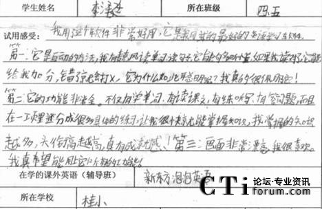 CTI论坛(ctiforum)1月21日消息(记者 潘婷婷):2010年12月,科大讯飞在天津市的两所小学举办了畅言互动英语学生版试用体验活动,同学们积极参与,在校园内掀起了一股练听力、学口语的英语学习热潮。通过实际试用体验,畅言互动英语学生版学习产品以其强大、实用的学习功能,得到了广大家长、学校师生的一致认可和充分肯定。
