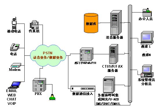 本方案采用西门子HiPath3750交换机,通过强讯中间件控制整个呼叫中心的电话呼入、呼出。它支持多种联络渠道,包括语音、交互式自动语音应答(IVR)、传真、短消息。