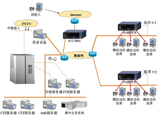 在河北地税12366原有设备的基础上,增加了一台ICC PBX,开放了若干端口,并在坐席计算机上部署了ICC终端软件,将12366传统的第四代呼叫中心,升级为第五代呼叫中心。