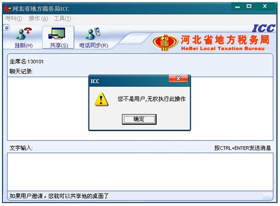 7. 远程共享:考虑到对纳税人电脑的安全保护,座席端没有权利主动共享纳税人的桌面,即坐席不能点击共享按钮,如果点击,将弹出对话框友好提示:“您不是纳税人,无权执行此操作”如下图: