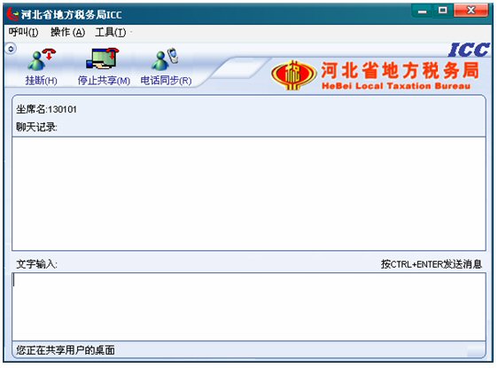 收到纳税人共享请求提示,如果坐席现在为全屏,收到纳税人共享请求,ICC界面将会自动跳到全屏的前端,弹出共享框。如果坐席现在不是全屏,收到纳税人共享请求,任务栏里ICC对话框将自动闪烁,弹出共享框。