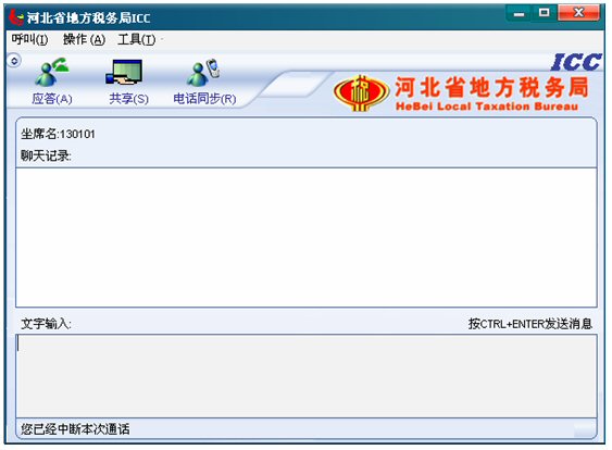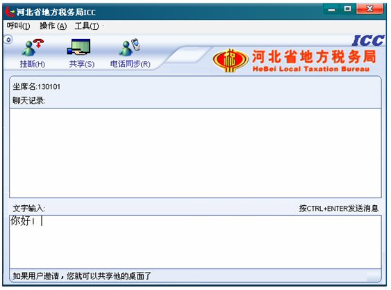 输入文字信息后按CTRL+ENTER就可发送消息。输入的文字可以在 ICC界面上面的聊天记录对话框中显示,同时发送给纳税人。如下图: