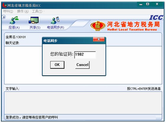 坐席只需通过电话将此框中的验证码(比如图例中的1982验证码)告诉和坐席通话的纳税人。然后点击OK按钮。纳税人端得到坐席告诉他的验证码后,纳税人端也有个电话同步按钮,纳税人点击并输入坐席告诉他的验证码后,坐席就可以看到有呼叫进来。此呼叫就是正和坐席通话纳税人的ICC呼叫。坐席点击应答后就可以和此纳税人ICC