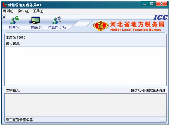 2. 点击12366界面下面一行按钮中的ICC按钮,运行起来ICC。出现ICC界面,此时ICC处于登录服务器状态,左下角的状态栏有文字提示“您正在登录服务器……”。聊天记录对话框的上面有坐席名,例如“坐席名:130101”如下图: