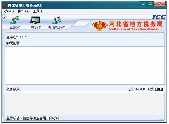 3. 稍等片刻,ICC登录成功,此时坐席就可以等待纳税人的呼叫了,左下角状态栏有文字提示“登录成功,请等待应答用户的呼叫”。如下图:
