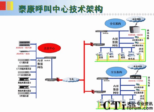 泰康电销中心采用交换机+CTI+录音+应用系统组成。在中心点普遍采用交换机模式。当中心点坐席规模大于60席位以数字中继模式接入。当分点新建数量不足60座席时,采用远端模式,相应采用交换机远端模块+CTI+录音+应用系统组成。