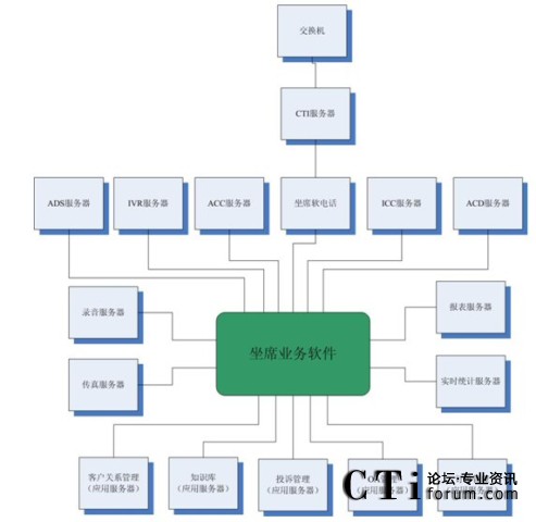 很多集成商或业务软件开发商认为这种结构过于复杂,而他们自身往往提供“整体解决方案”,即所有的服务器软件基本上都是自己的,根据客户的要求修改即可。例如,客户关系管理、知识库、投诉管理、OA、订单管理以及坐席软电话、ADS服务器、IVR服务器、ACC服务器、ICC服务器、ACD服务器、录音服务器、传真服务器、报表服务器、实时统计服务器都是自己来做,那么对于很多接口环节都可以节省了。