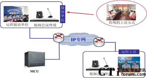 以如上示意图为例所示,系统基于省公安IP数据专网,采用H.323(或H.320)体系标准,以省公安厅为二级网控制中心和主会场,地市公安局为三级网控制中心和三级网主会场,区县分局为接入网控制中心和主会场,各基层派出所单位为接入网分会场。