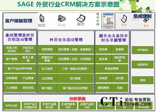Sage CRM外贸行业解决方案,全面提供外贸企业基础管理、外贸营销活动、外贸业务管理、跟单业务管理、财务单据管理功能,还可以提供经营管理层使用的报表分析中心。通过系统数据的采集与分析,提供给管理层及经营层实时业务分析数据,提高企业的运作效率,为外贸型企业创造更大效益。