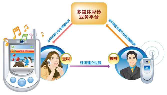多媒体彩铃业务由被叫用户申请,可以根据不同的主叫用户分类提供不同的回铃流媒体。提供一种基于不同主、被叫的差异化、多媒体铃音服务。