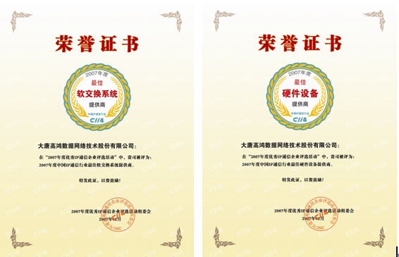 日前,由C114中国通信网主办的“2007年度优秀IP通信企业评选活动”圆满结束。大唐高鸿数据网络技术股份有限公司(以下简称“大唐高鸿”)凭借雄厚实力喜获“2007年度中国IP通信行业最佳软交换系统提供商”和“2007年度中国IP通信行业最佳硬件设备提供商”两项大奖。这是大唐高鸿继2007年4月荣获中国VoIP论坛“2006年最佳中继网关提供商”和“2006最佳VoIP解决方案提供商”两项大奖之后的又一次实至名归。