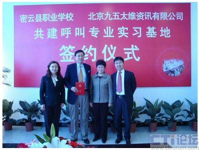 CTI论坛(ctiforum)04月30日消息: 近日,密云县职业学校与北京九五太维资讯有限公司校企合作共建呼叫专业实习基地签约仪式在密云县职业学校隆重举行,市教委职成处处长李敏,县委常委副县长王春林、副县长钱福生、副县长徐芳出席签约仪式并发表了讲话。密云县教委主任李钟勤,北京九五太维资讯有限公司董事长汪远,首席执行官李宝民及其培训师团队,密云县经济开发区总公司及部分入区呼叫企业出席了签约仪式。在签约仪式上,密云县教委主任李钟勤向九五太维公司首席执行官李宝民博士颁发了聘书,聘请李宝民博士为密云县职业学校名誉校长。