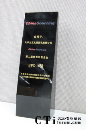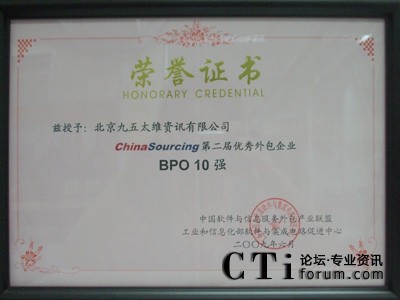 CTI论坛(ctiforum)06月16日消息: 日前,从国家工业和信息化部传来喜讯:北京九五太维资讯有限公司2009年蝉联“中国BPO企业10强”。