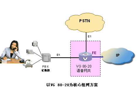 将VG 80-20连接在在PBX和PSTN网之间,使用VG 80-20的一个E1语音接口连接PSTN,另一个E1语音接口连接PBX。由语音网关根据拨号策略决定使用PSTN呼叫还是VoIP呼叫,实现自动选路功能。这样可以在拨号方式和电话号码也不需要作任何改变的情况下,实现长途旁路IP电话功能。