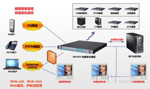 基于毅航通信ISX4000多媒体交换机的IVVR或视频呼叫中心系统平台可同时支持3G网络、2G以及Internet网络的接入;支持视频、语音、传真、邮件、短信等全方位服务模式;支持集中和IP分布式部署,座席数随时随地任意伸缩,可轻松形成一个跨区域、集语音和视频于一体、统一的视频呼叫中心系统。