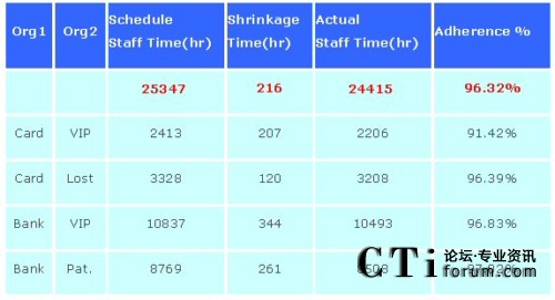 提供经过异常抚平与班表结算过后的遵时率,通常做为考核评比的重要项目之一,此报表是呼叫中心用来管理人员绩效的重要资料来源。