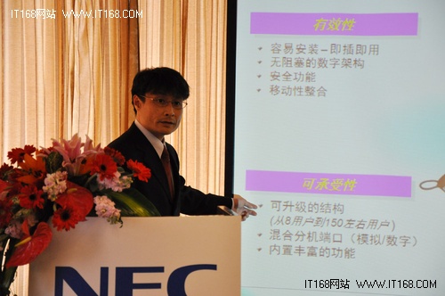 2011年3月28日,国际通信行业巨头日本电气株式会社(以下简称NEC公司)在北京举办新品发布会,宣布最新智能通讯服务器SL1000正式上市。发布会上,NEC公司IT网络国际解决方案组平台事业部副总裁橋沢太一郎先生阐述了对未来中国市场的市场策略和远景目标。