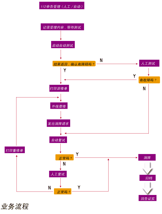 3. 查修员在障碍修复后,通过远程启动测试确认障碍已经修 复,可拨打中心112并在语音提示的情况下输入工号密码及请求消障的号码、故障点及故障原因等信息完成消障请求工作。测量中心及时通过自动及人工的复试操作保证消障的真实性,若复试后发现仍有故障,则拒绝消障请求,打印重派单。在查修故障的过程中,系统跟踪每一张打印的派修单,如果超时未修复,则系统将打印催修单。