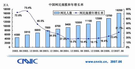 1、上网人数持续发展,截止到2007年6月底,已达1.62亿。手机上网人数已达4430万,而上一年这个数字为1700多万。