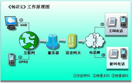 具体来讲就是在手机里安装“畅话宝”应用软件(在计算机桌面提供web客户端),该软件带有通信录和触发GPRS的功能,可以通过无线互联网将电话号码发送到平台,通过PSTN发起通话(2方或多方)。这个手机客户端软件,可无缝对接到固网增值业务平台上(多方通信平台)。客户端软件自身携带有通信录功能,调用方便。部分机型可调用手机本身的通信录。