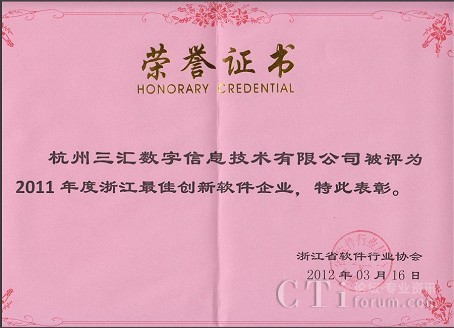 CTI论坛(ctiforum)3月23日消息(记者 浩宇): 2012年3月,浙江省软件行业协会公布了2011年度浙江省软件行业评优结果。我们杭州三汇数字信息技术有限公司被评为“2011年度浙江最佳创新软件企业”,同获此殊荣的还有阿里巴巴、浙江中控、恒生电子、信雅达、海康威视、三维通信等其他9家国内外知名的软件企业。