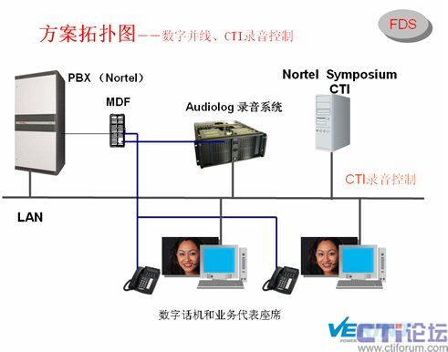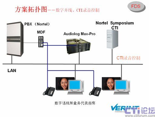 Audiolog录音系统能和Nortel交换机、Symposium CTI进行整合,获取CTI随路数据便于用户录音资料检索。
