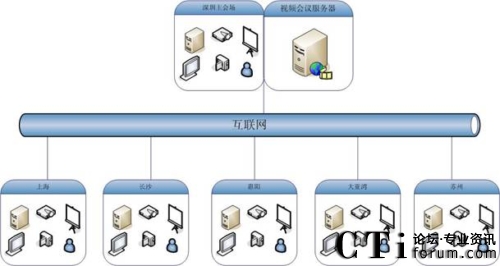 如图,深圳南山地产视频会议系统应用规模为6个点,包括深圳、上海、长沙、惠阳、大亚湾、苏州。服务器部署在深圳用来保证香港和内地的链接效果,服务器出口带宽为3M共享,各分会场通过互联网访问服务器。在这个网络平台上,红杉树网络会议所提供的高质量音视频图像、方便易用的文档、文件共享数据功能,使得南山地产能够在这个平台上进行从桌面讨论到会议室正式会议等各种规模的应用。在这个平台上,除了进行日常例会、业务交流等常见的应用之外,业务培训、异地招聘等也是经常进行的内容。业务人员利用数据功能,节约了以前培训所花费的大量精力和时间,为新项目迅速占领市场掌握了主动。
