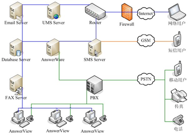AnswerWare系统包括服务端控制程序、UMS(统一消息服务)平台、DialWare和客户端程序AnswerView。