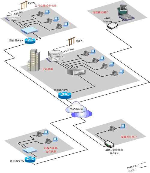 采用3COM NBX系统我们可以为用户提供移动的、灵活的办公电话系统,本系统的远程Internet接入采用ADSL或专线方式。