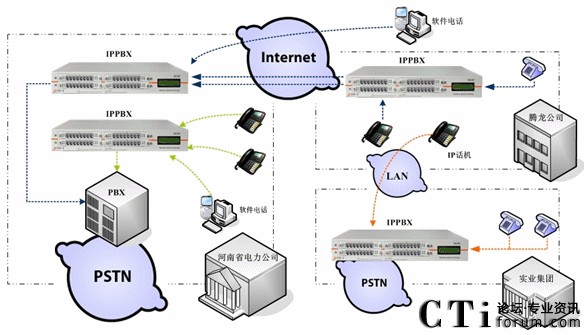 · “河南电力”可以分别对公司内部以及地处不同区域的“腾龙公司”和“电力实业”的IP话机提供服务;