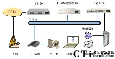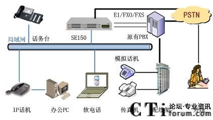此方案适用于已经部署了传统PBX的企业。要求企业部署好数据网络,如果采用模拟终端,则企业的各个办公点需要先将网络线路和电话线路部署到位,同时企业原有的PBX要预留与SE150对接的接口。
