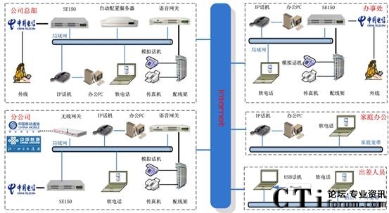分布式部署:总部和各分支机构的分机,是通过IP网络融合在一个语音平台上来实现内部通信。总部和办事处分机、家庭办公分机、出差人员的软电话均注册在总部的SE150上,各分公司的分机注册在本地的SE150上,由本地的SE150管理。