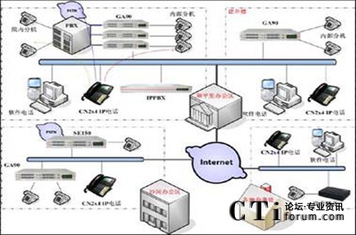 由于总部的网络带宽充足,因此部署了一台核心IP PBX服务器——MCS1000。负责处理来自GA90、CN2x4、以及软件电话的语音业务并给该系统配置一个公网的IP地址,适合于移动办公的公网用户,及没有实现VPN的办事处的接入,直接通过公网注册到该核心系统上来,然后通过相关的配置,统一管理下属的语音终端设备。