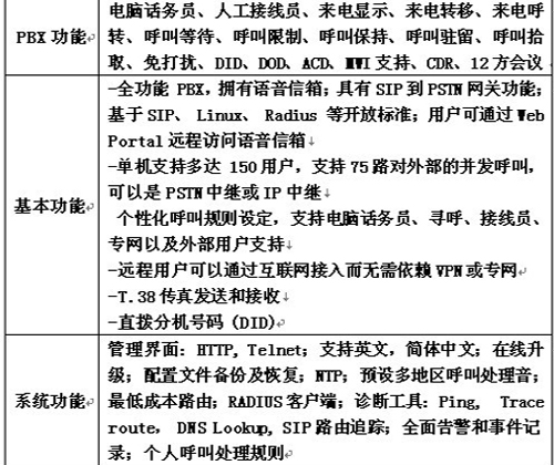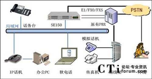 中小型企业语音通信系统集IP-PBX、语音网关、互联网网关等多种功能于一身,可以兼容传统PBX的全部功能,同时也可作为VoIP网关使用,把基于IP的SIP通讯转换成PSTN通讯。通过采用开放的标准协议,系统(SE150)可以兼容众多国际、国内IP电话、语音网关厂家的产品。