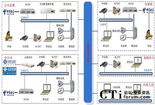 - 分布式部署:总部和各分支机构的分机,是通过IP网络融合在一个语音平台上来实现内部通信。总部和办事处分机、家庭办公分机、出差人员的软电话均注册在总部的SE150上,各分公司的分机注册在本地的SE150上,由本地的SE150管理。