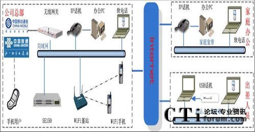此方案适用于具有“移动办公、频繁出差、家庭办公”需求的企业。系统要求企业内部部署好数据网络,如果采用模拟终端,则企业的各个办公点需要先将网络线路和电话线路部署到位。如果需要应用WIFI终端,则需要部署WIFI网络。