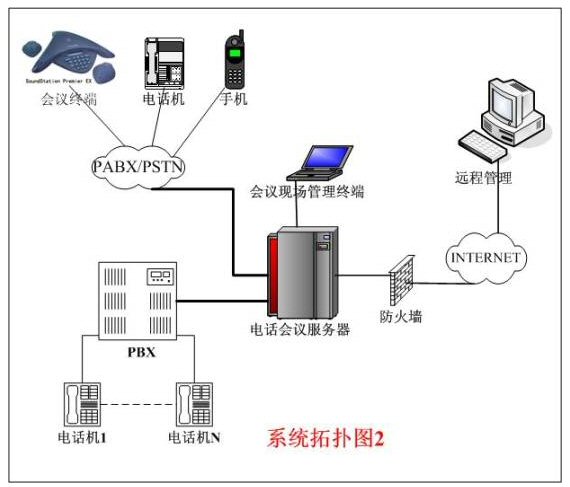 整个系统的拓扑结构一般有以上两种连接方式,拓扑结构如上图所示。图1中的用户交换机直接和公网PSTN或电信交换机相连。异地与会者必须先进入用户交换机后,再进入电话会议主机。图2中的连接方式是把电话会议系统主机直接和公网PSTN或电信交换机相连,异地与会者直接通过公网进入电话会议主机。
