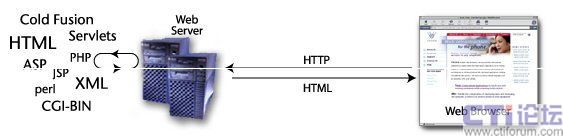 在互联网上,浏览器通过Internet协议――比如HTTP――向Web服务器发出请求,而Web服务器上存放着静态页面和动态应用,它们将把HTML返回给浏览器,最终结果在浏览器中展现出来。如下图所示: